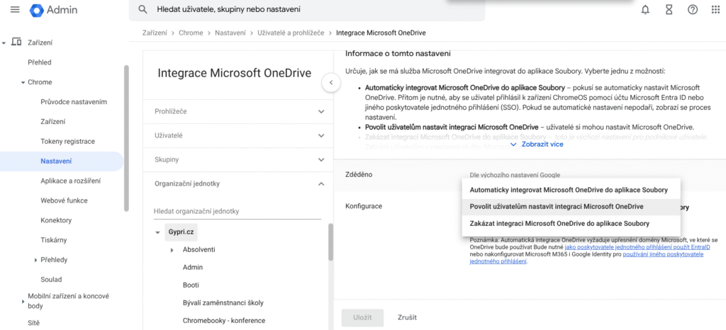 - V levé části vyberte organizační jednotku, pro kterou chcete OneDrive zpřístupnit (např. žáci, učitelé).
