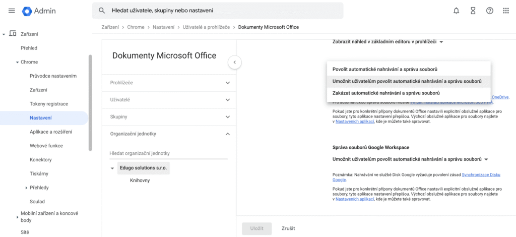 Poté se vraťte o jeden krok zpět do předchozí nabídky a vyberte položku Dokumenty Microsoft Office. Zde povolte volbu Správa souborů Microsoft 365. Doporučujeme zvolit možnost „Umožnit uživatelům povolit automatické nahrávání a správu souborů“ (viz obrázek níže), která zajistí bezproblémovou práci s dokumenty ve formátu Office přímo v prostředí Chromebooku. Nezapomeňte vše uložit.