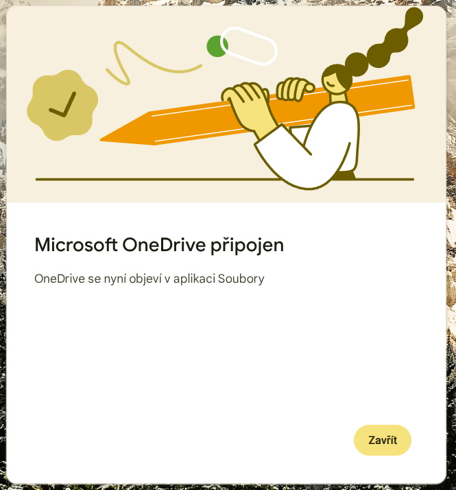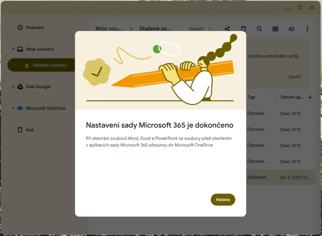 Pokud jste postupovali správně, Chromebook zobrazí okno s potvrzením, že váš účet Microsoft OneDrive byl úspěšně připojen. Ve správci souborů nyní uvidíte novou záložku Microsoft OneDrive (viz obrázek níže), ve které se zobrazují všechny složky a soubory uložené ve vašem cloudu Microsoft.