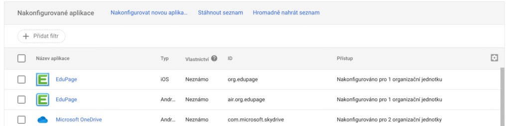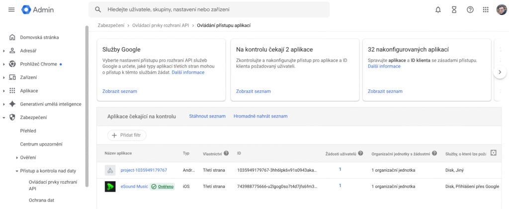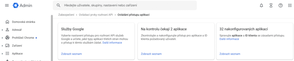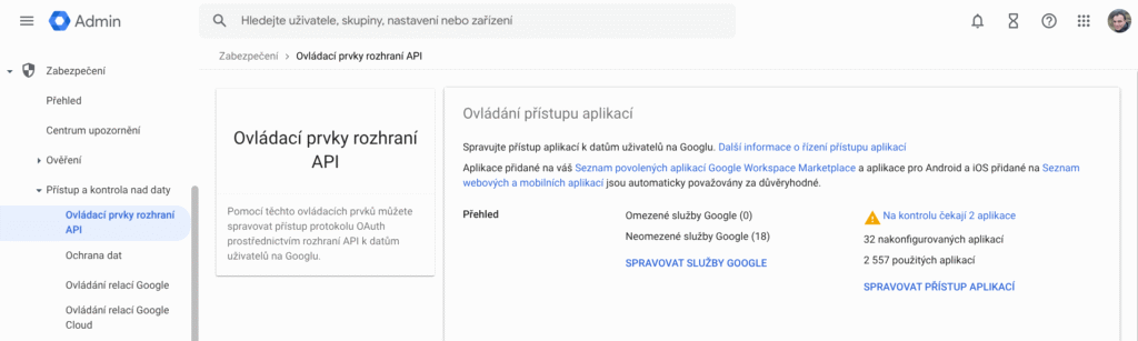 - Zde najdete možnost spravovat aplikace, které čekají na kontrolu k přístupu ke Google účtu vaší školy.