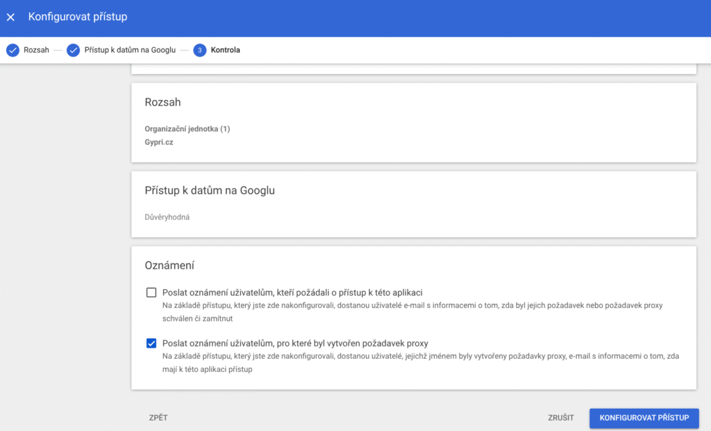 - Poté se zobrazí přehled s možností finálního schválení prostřednictvím modrého tlačítka Konfigurovat přístup.